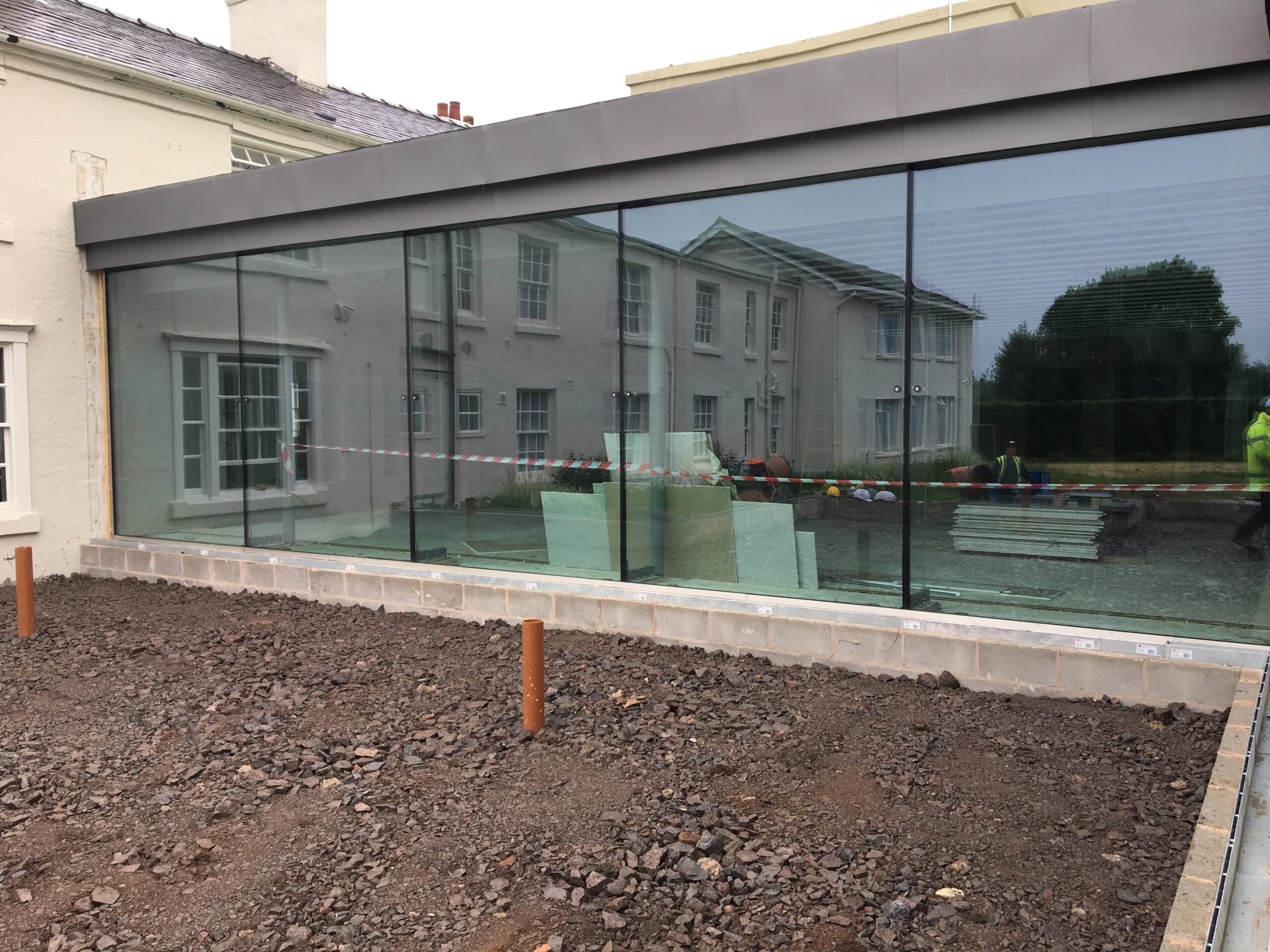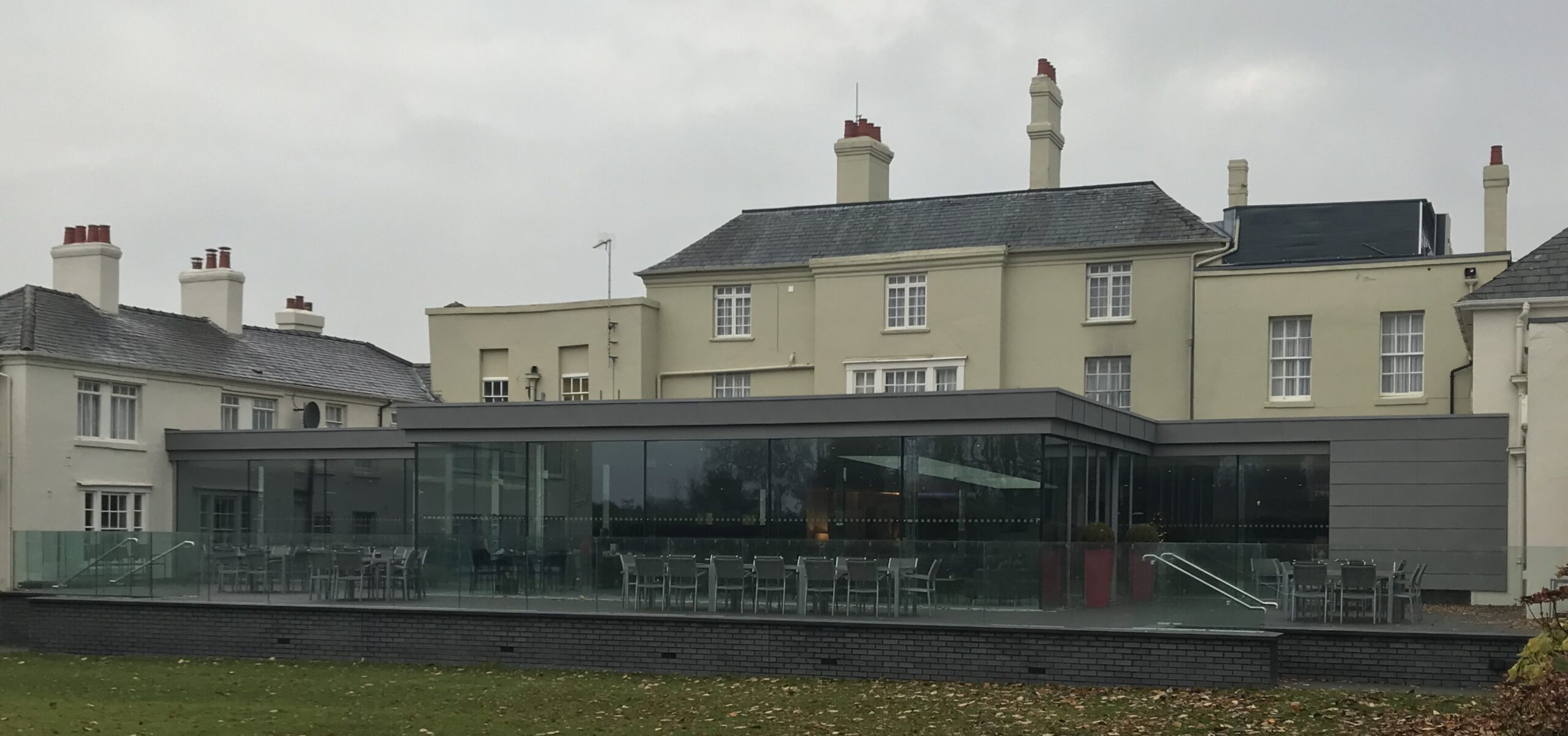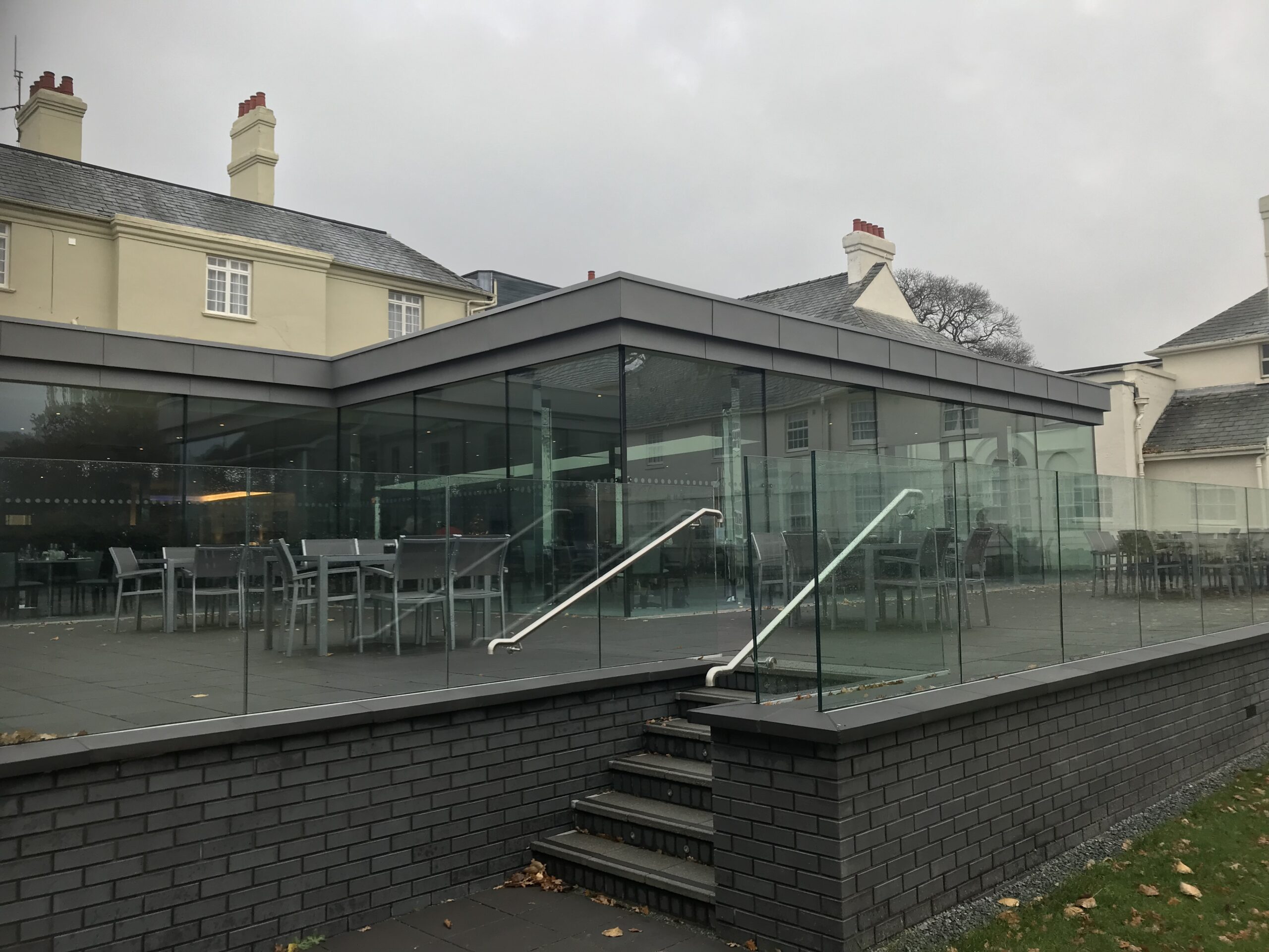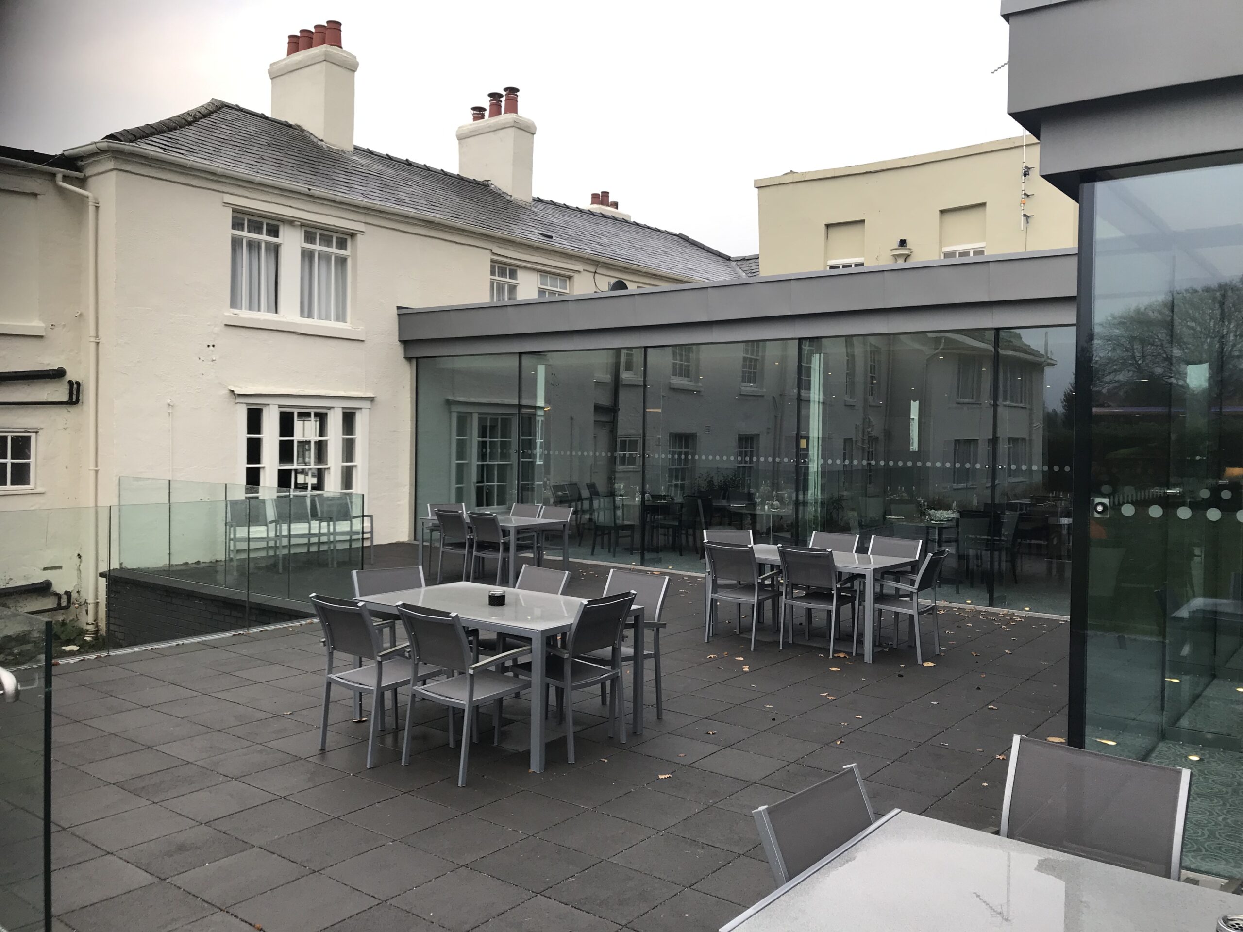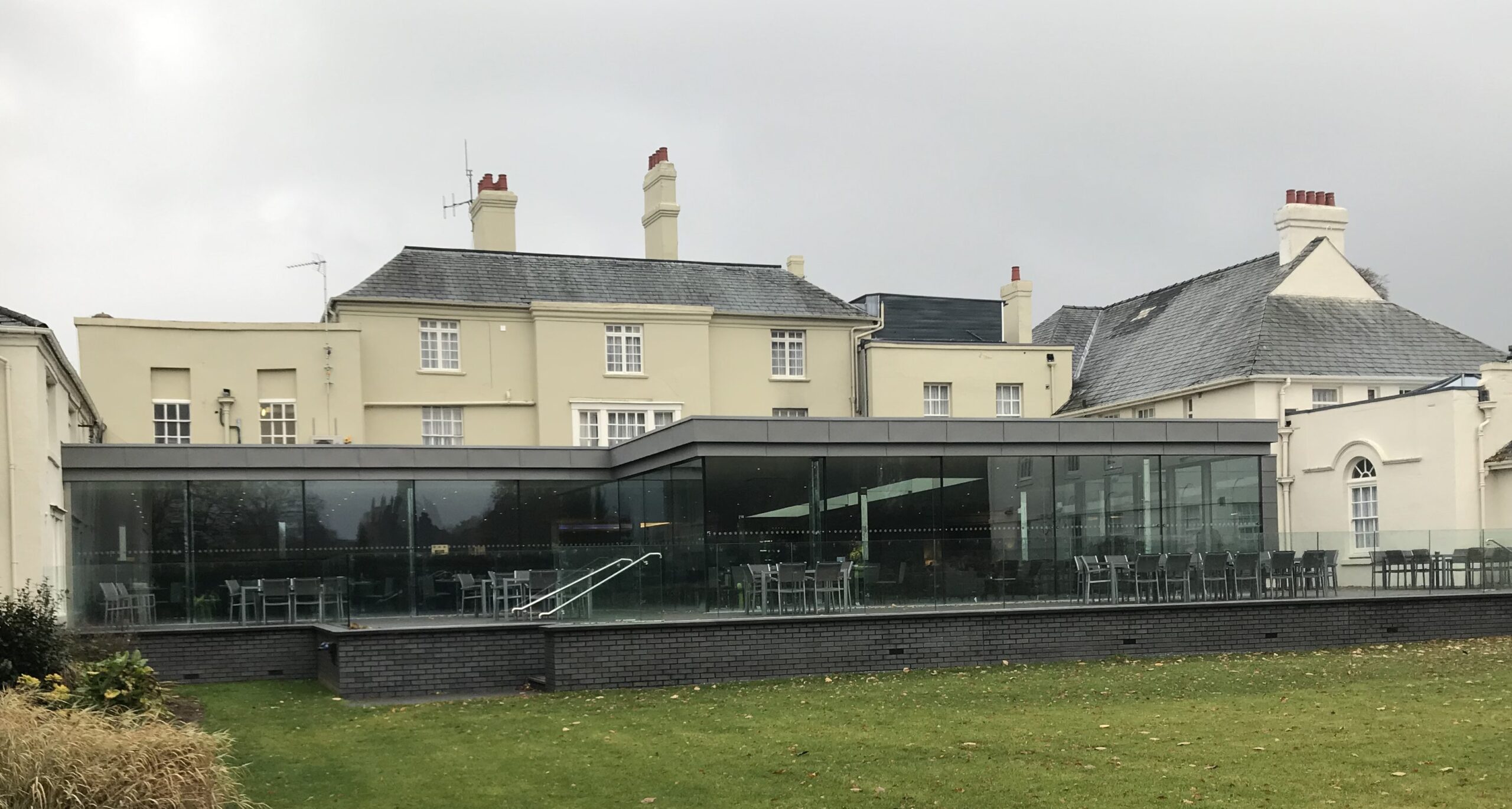 A new extension comprising of a bar and restaurant area to service the historic Hawkstone Park Hotel. The restaurant and bar area has windowed walls looking out onto the garden area, a large raised patio area surrounded by a glass balustrade and large glazed skylight offering a light and spacious feel. The modern building strikes a fierce contrast to the existing buildings on site and utilises the benefit of zinc and glass to stand out as a real feature for weddings and functions. The building also boasts a green roof offering environmental benefits to the hotel and assisting in carbon reduction for the project.